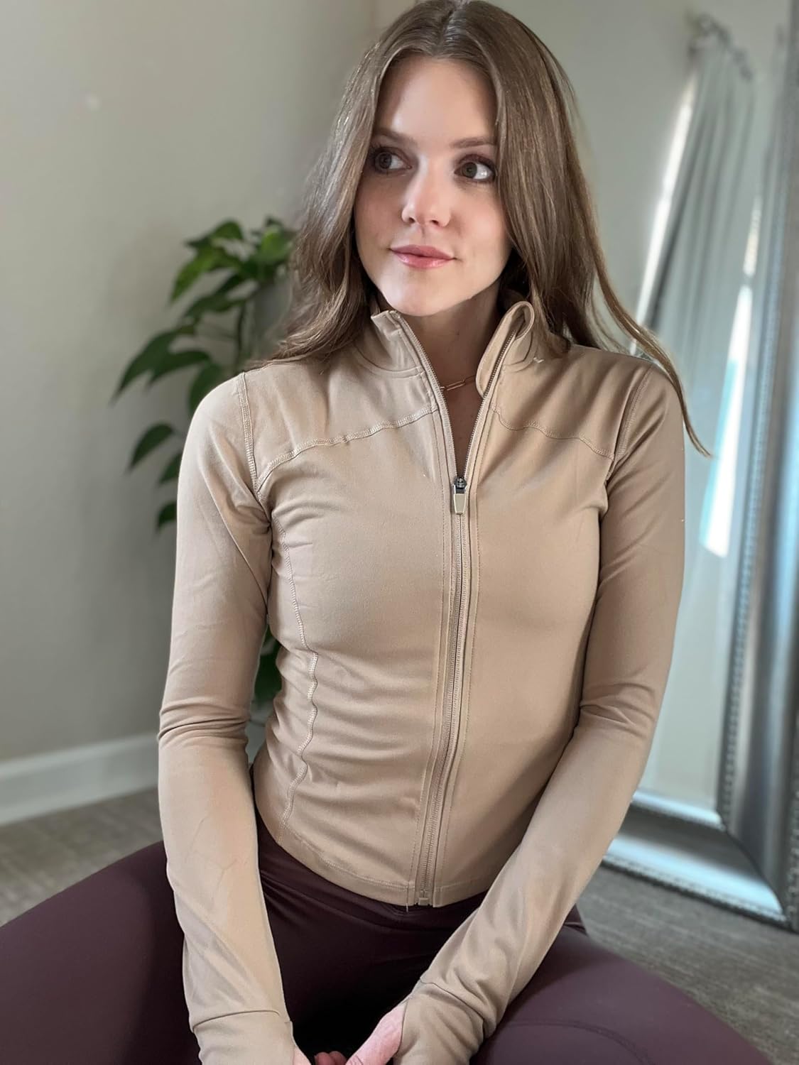 Customers find the workout jacket comfortable and flattering, noting it’s not too loose or tight, and one mentions it gives a nice hourglass shape. Moreover, the material quality is good, it holds up well, and customers appreciate its stretchiness and value for money. Additionally, they like the color options, with one customer noting it matches with everything. However, opinions about the material thickness are mixed, with some finding it nice while others say it’s not great.