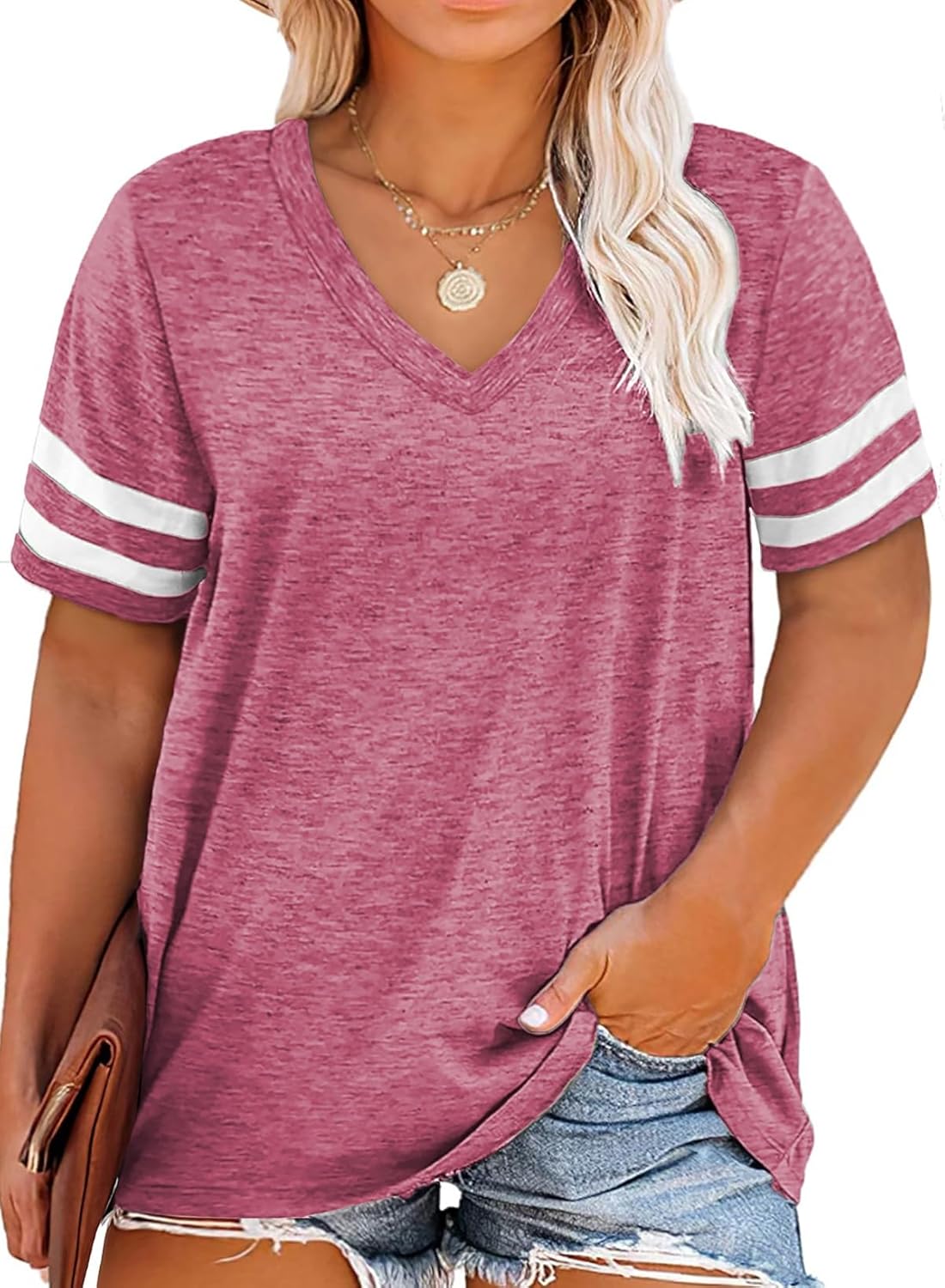 Happy Sailed Womens Plus Size Tunic Tops Summer Short Sleeve V Neck Striped Loose Casual Tee Shirt(1X-5X)