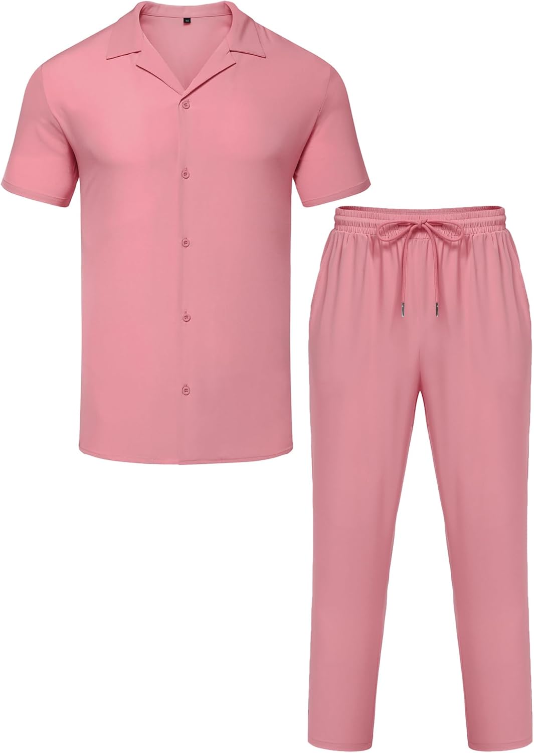 LecGee Mens Short Sleeve Button Down Solid Outfit Long Pant 2 Piece Summer Sets