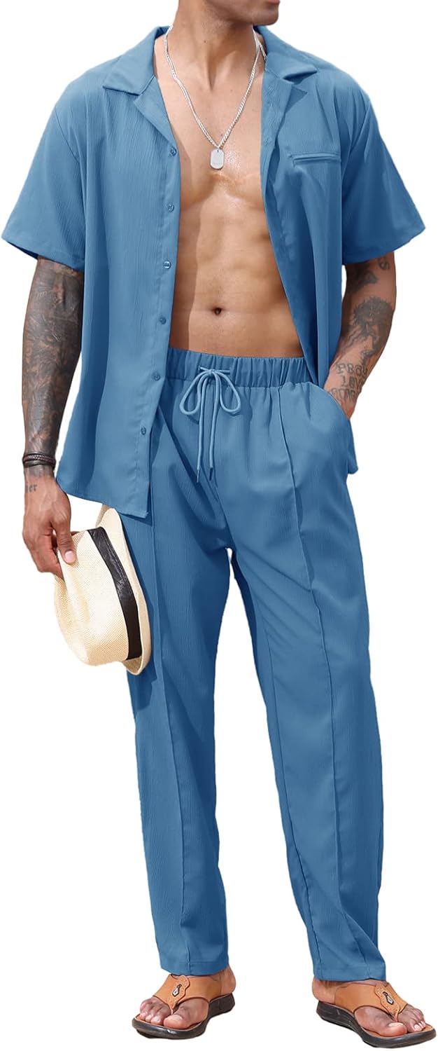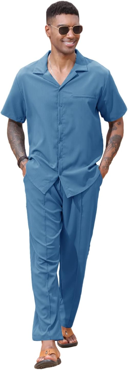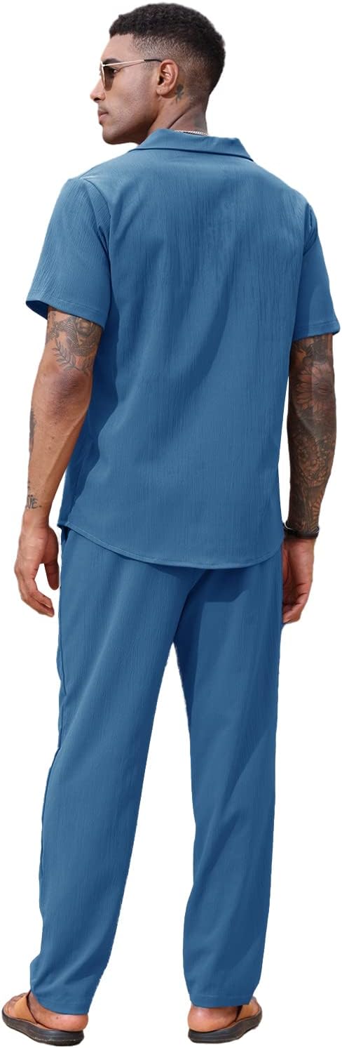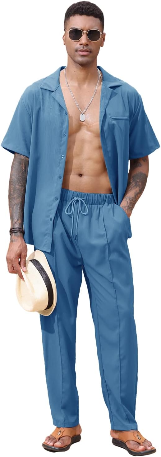 Lexiart 2 Piece Set for Men Beach Outfits Cuban Collar Button Down Shirt Darwstring Pants