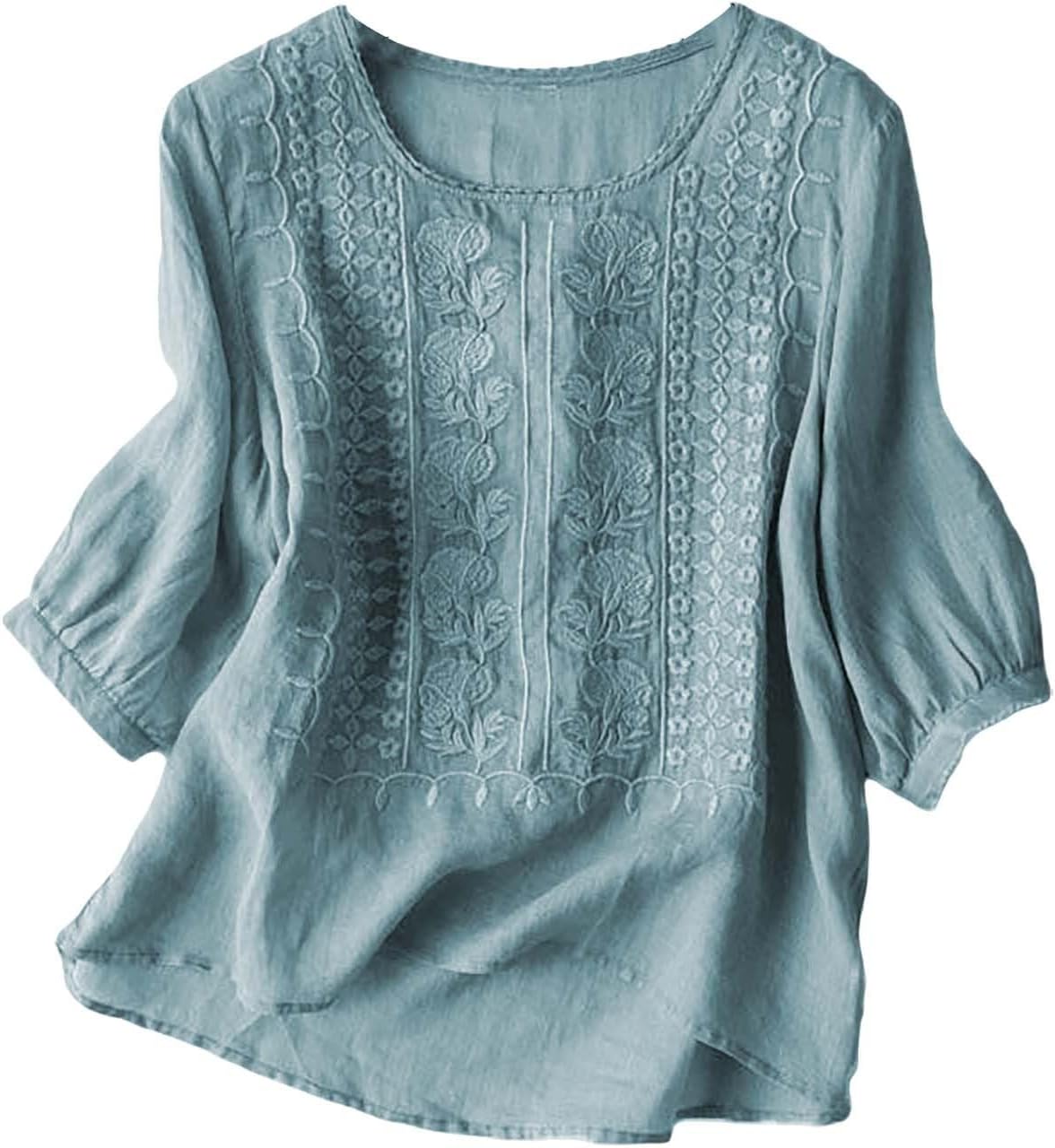 Linen Shirts for Women Summer 2025 Retro Embroidered 3/4 Sleeve Boho Tops Dressy Casual Blouses Teacher Loose Tunics