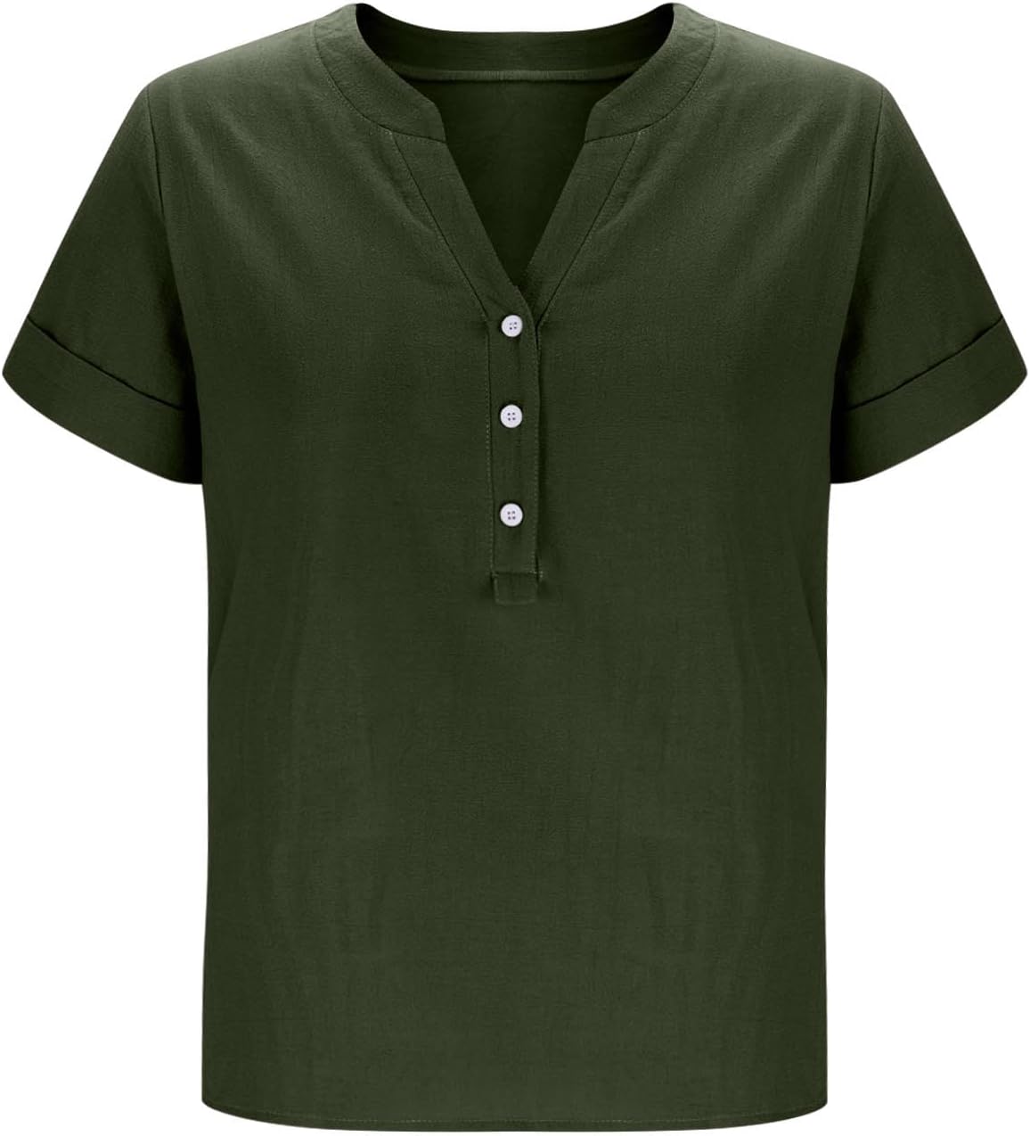 Linen Tops for Women 2025 Summer Button Down V Neck Shirts Casual Short Sleeve Loose Tshirt Cotton Linen Blouse Tees