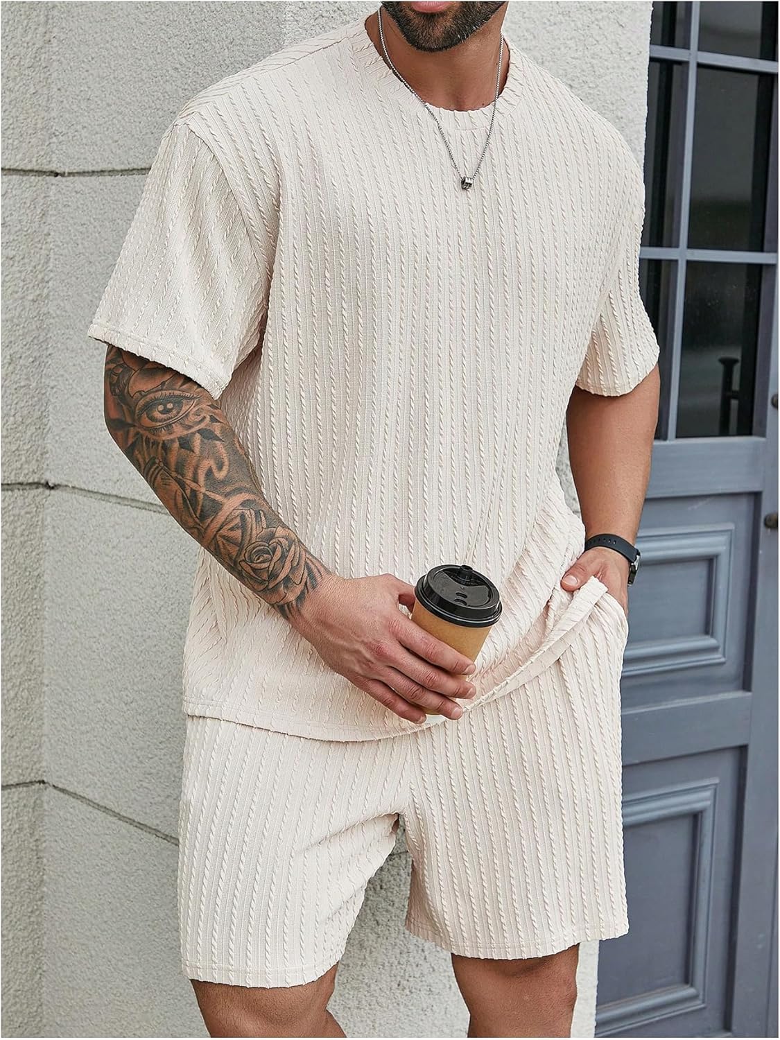 Men’s 2 Piece Outfits Summer Beach Outfits Men's 2 Piece Outfits Textured Drop Shoulder Short Sleeve Tee Tops and Short Sets Summer OutfitsMen's 2 Piece Outfits Textured Drop Shoulder Short Sleeve Tee Tops and Short Sets Summer Outfits