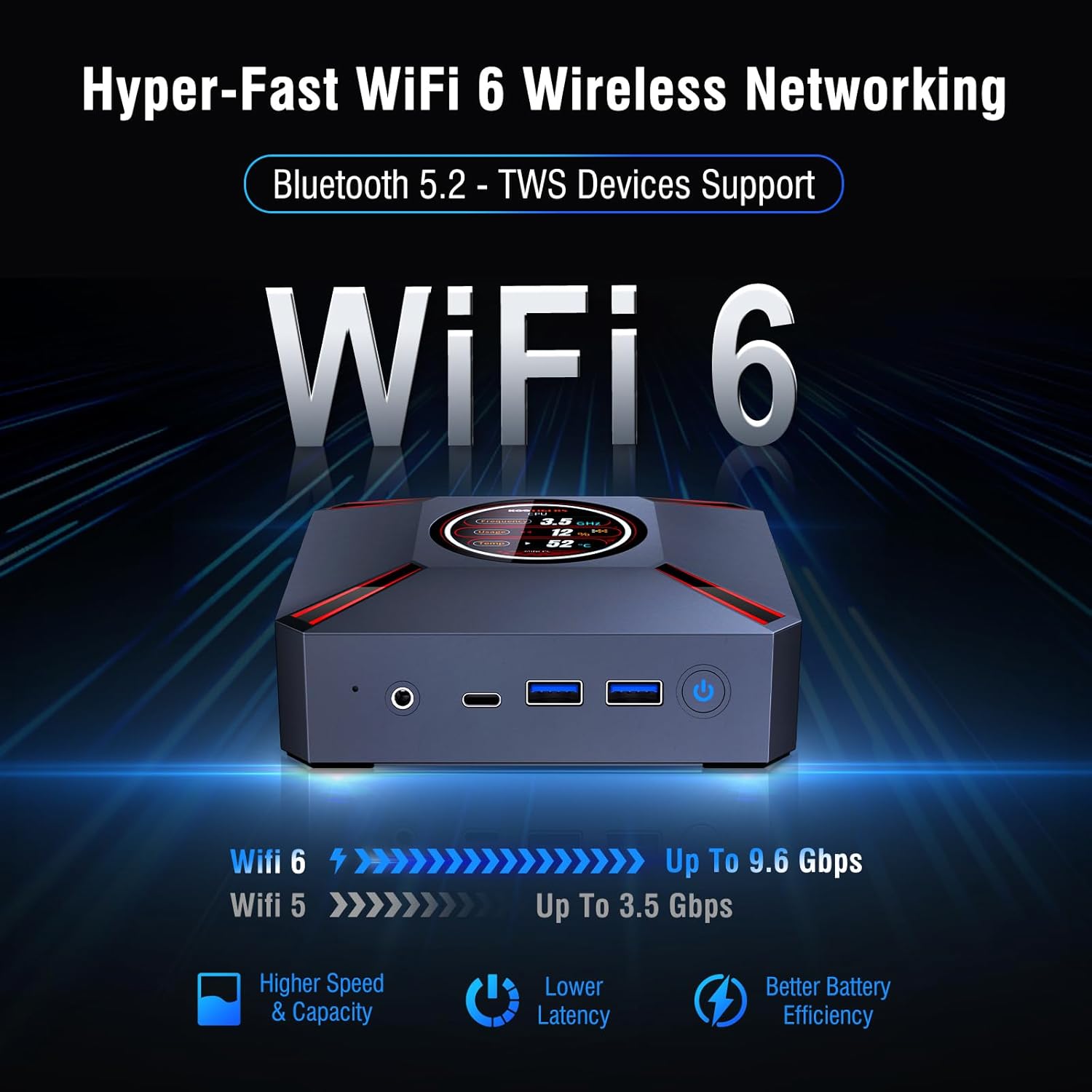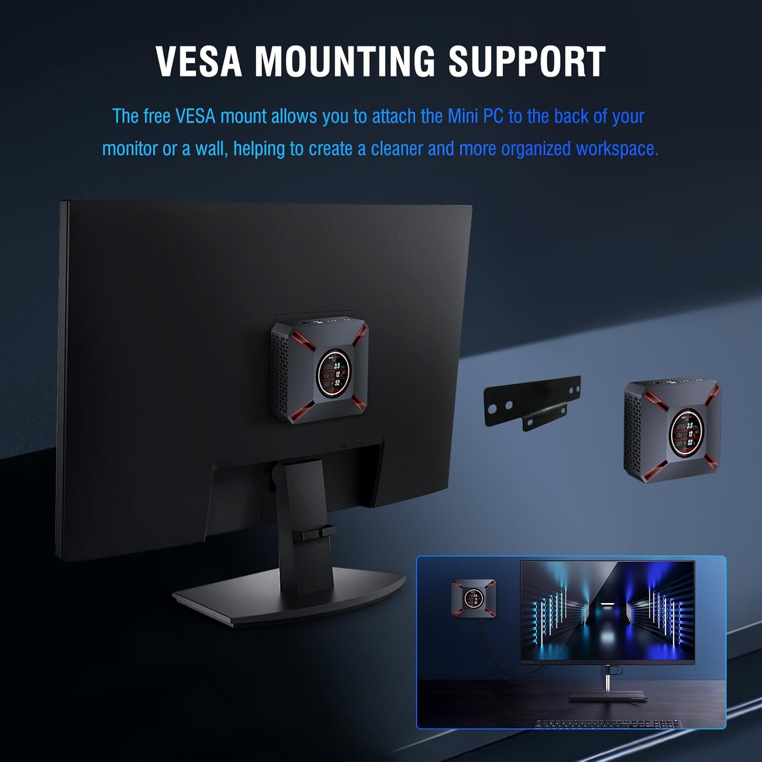 ✅ Built-in LCD Screen for Real-Time Monitoring: Unlike other mini PCs, our computer features a 2.1-inch LCD screen to display real-time system data (CPU/GPU temp, RAM/SSD usage, fan speed) without external monitors. Once powered on, the display lights up and provide