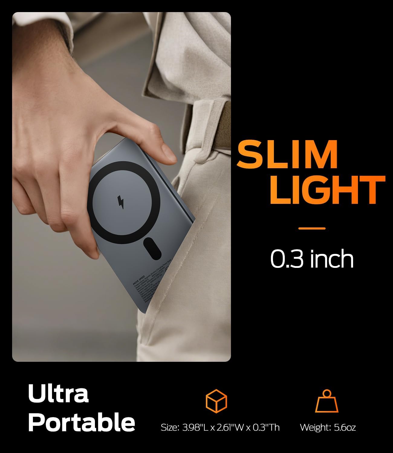 MOVE SPEED 0.3” Ultra Slim MagSafe Portable Charger, 5,000mAh Magsafe Battery Pack, Magnetic Power Bank for Dual Use with a USB C Cable/Port for iPhone 16/15/14/13/12, Glacier Gray