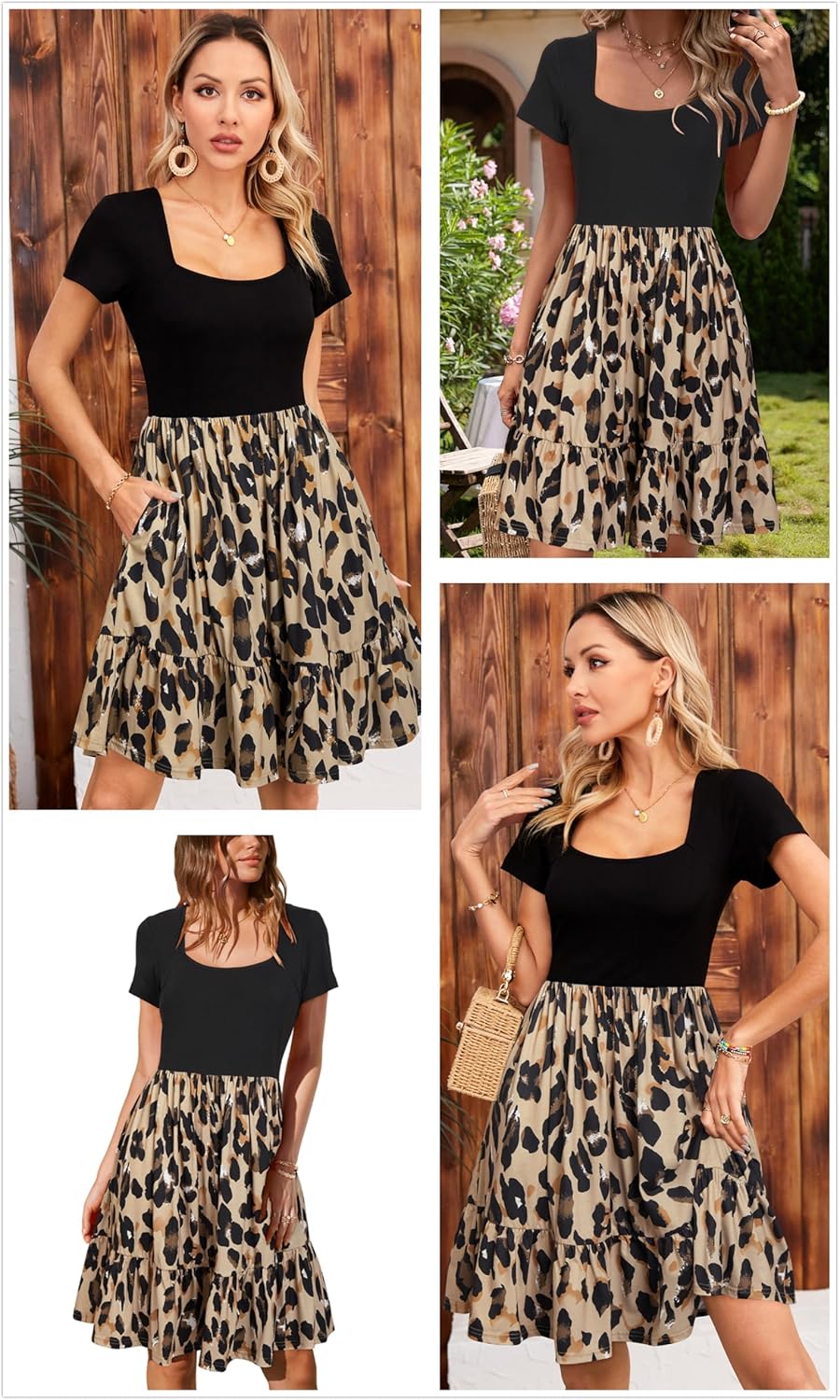 SHORT SLEEVE/CASUAL BOHO/SQUARE NECK/FIT AND FLARE/SWING FLOWY HEM/A-LINE STYLE