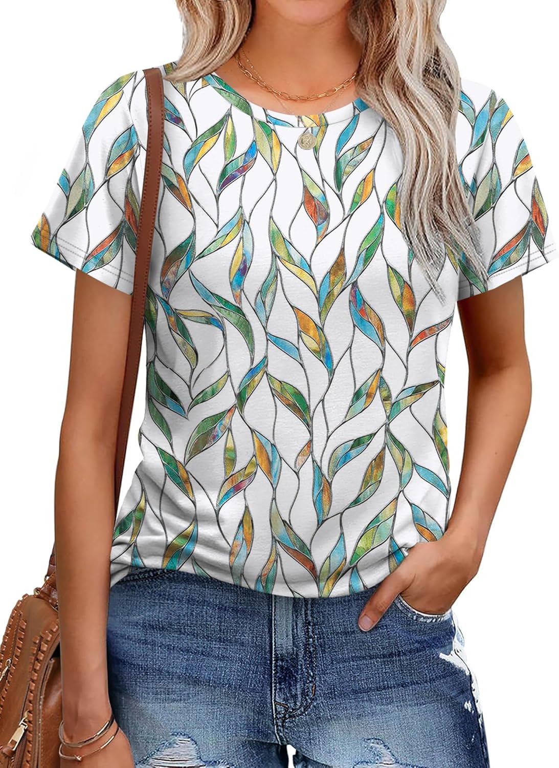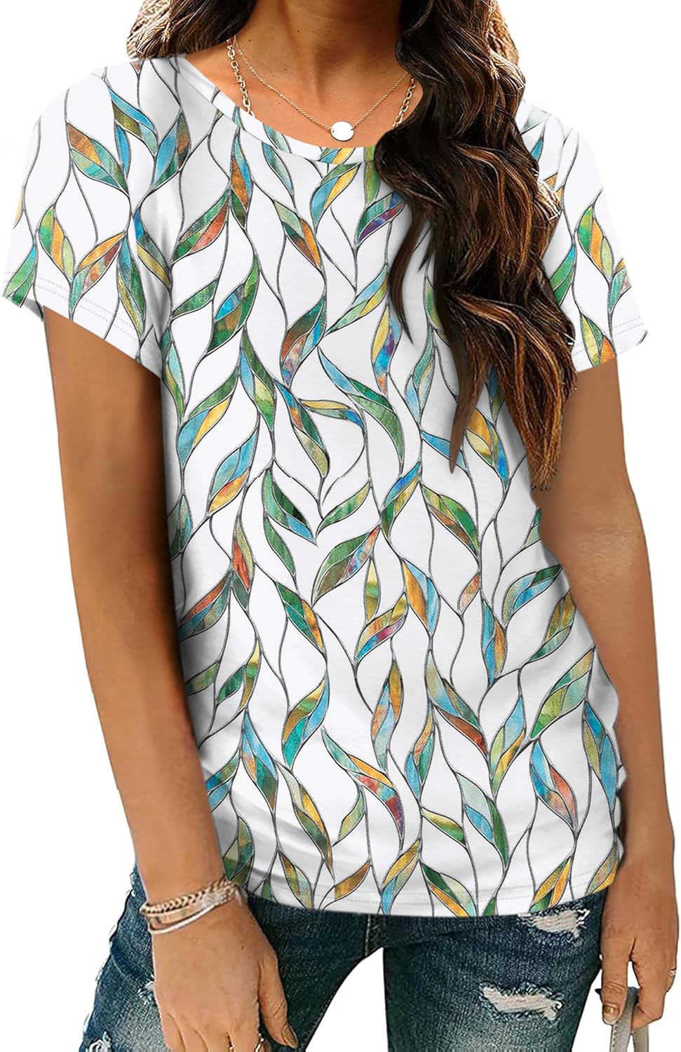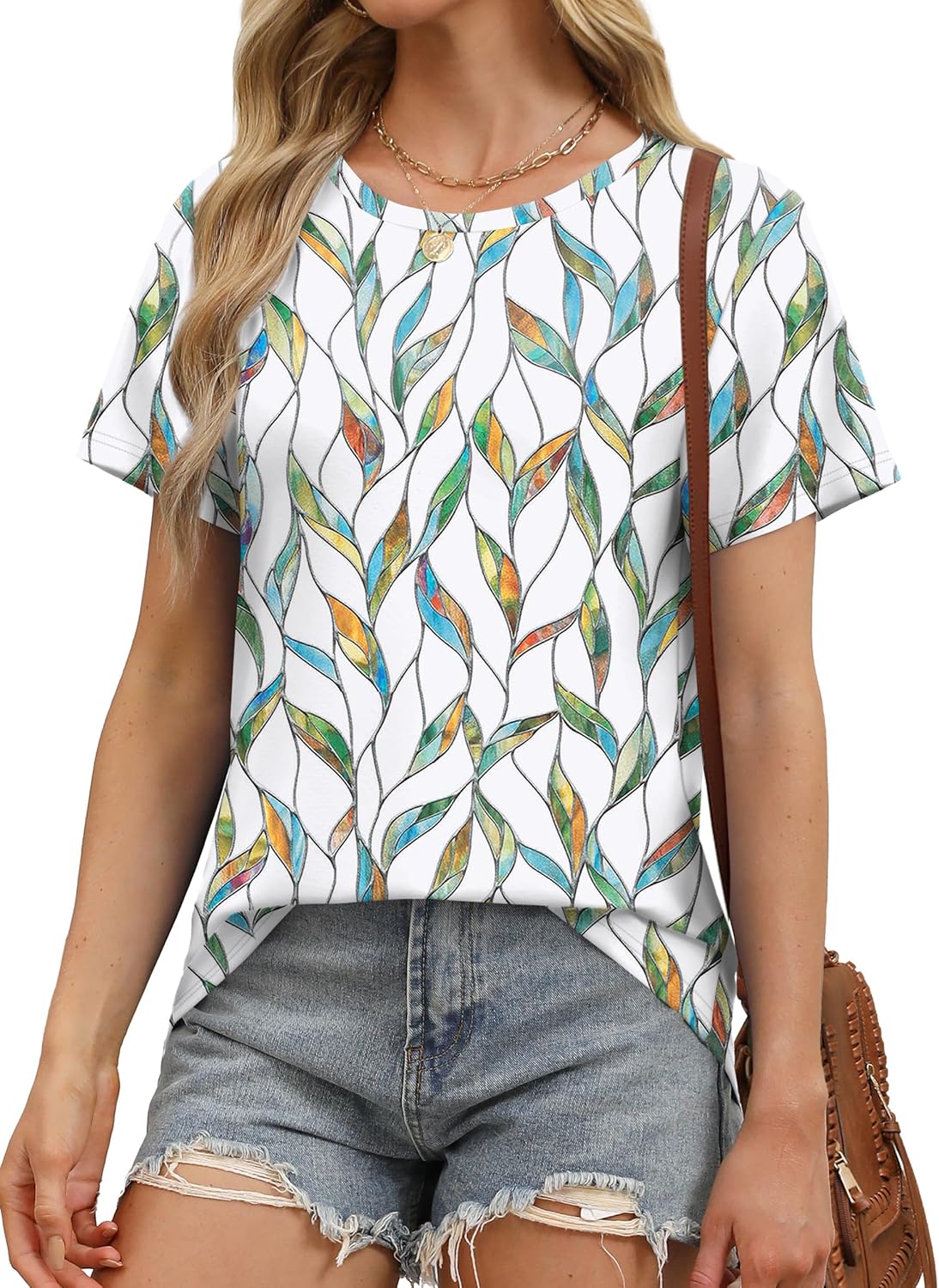 OFEEFAN Floral Tops for Women Boho Summer Printed Short Sleeve Tshirts Casual