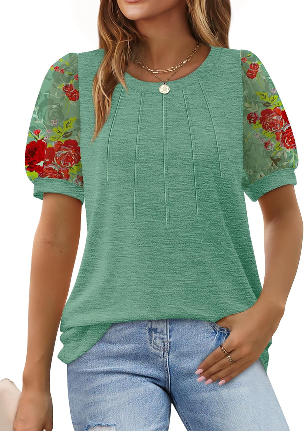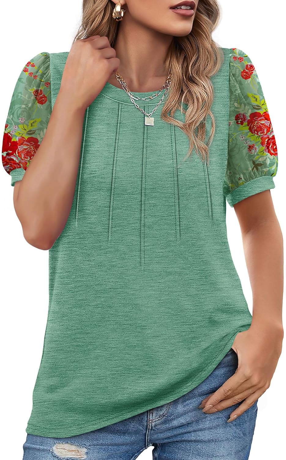 OFEEFAN Womens Summer Tops Pleated Swiss Dot Puff Sleeve Crew Neck T Shirts Loose Casual S-3XL