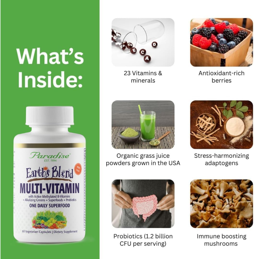 Paradise Herbs Earth’s Blend Women’s Once Daily Multivitamin with Iron, 48 Organic Superfoods, Probiotics, Antioxidants, Vitamins A, B12, C, D, K2, 60 Capsules