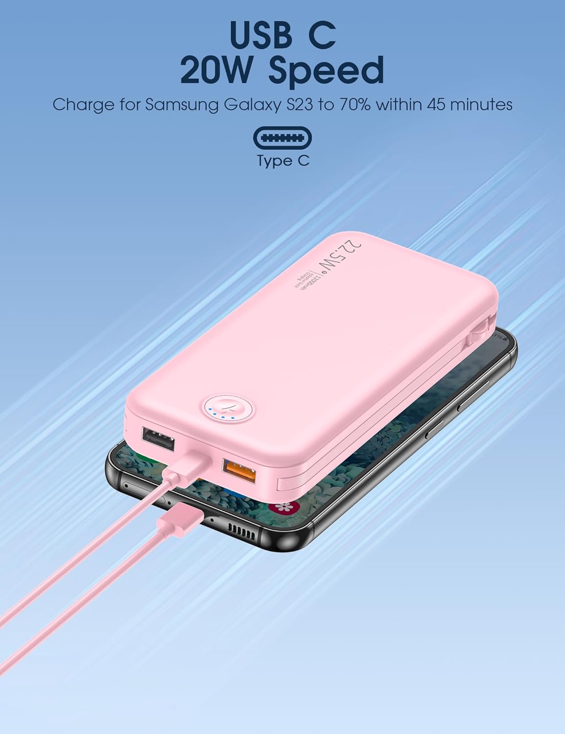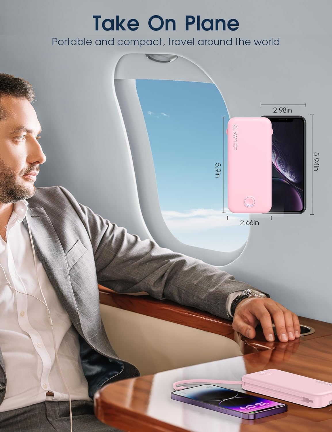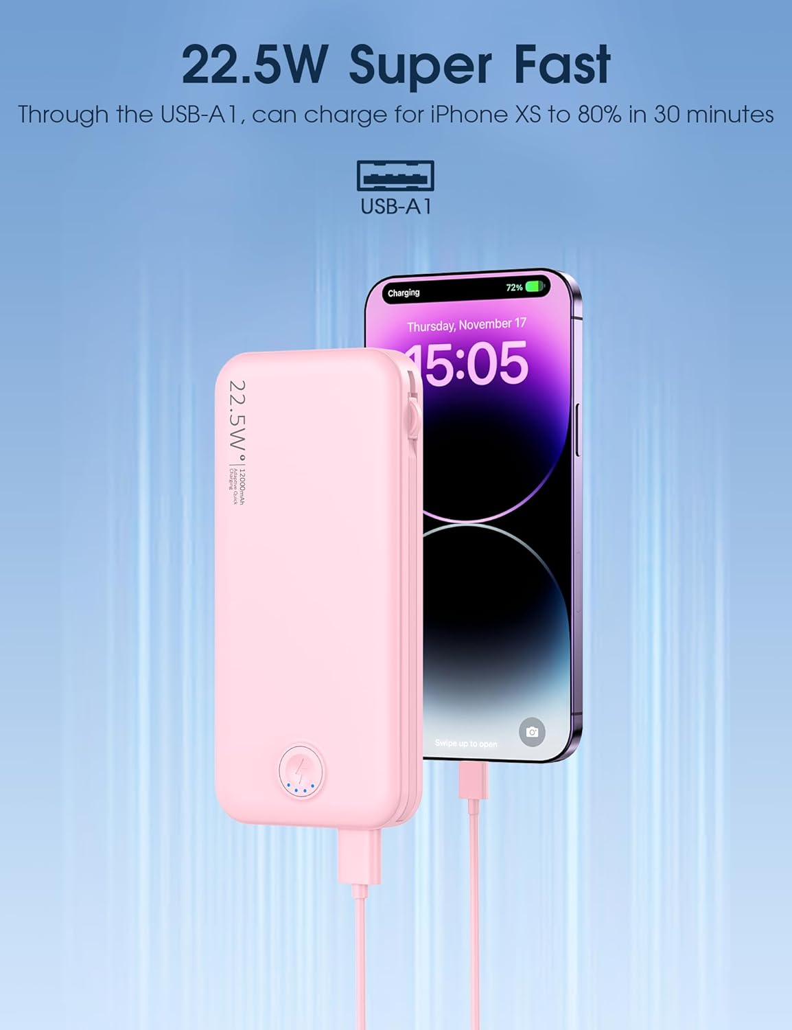 Portable Charger with Built in Cable and AC Wall Plug, USB C Power Bank 12000mAh 22.5W Super Fast Charging, Lightweight Portable Phone Charger Travel Battery Pack for iPhone, Samsung, Tablets