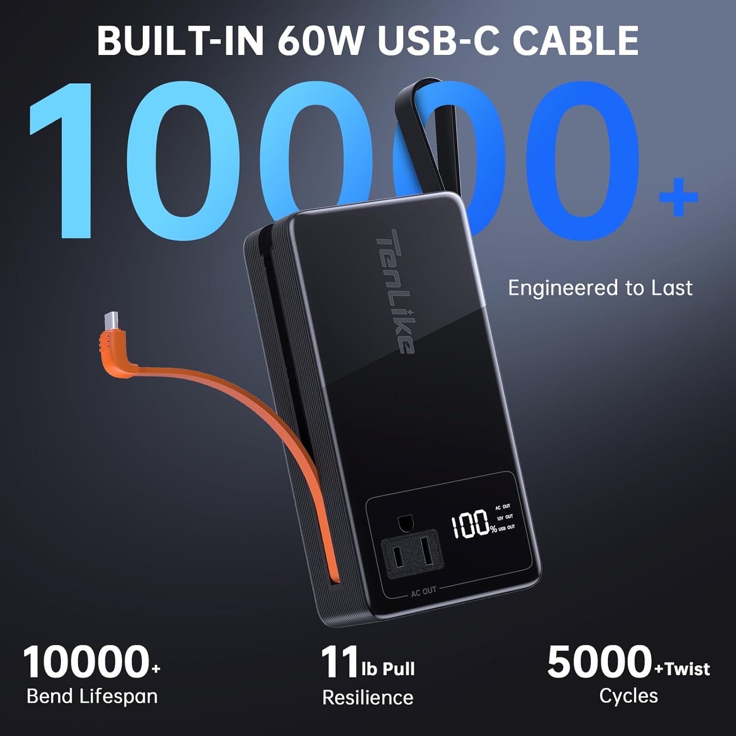 【Built-In 60W PD Fast Charging Cable】Our Tenlike power station features a built-in 60W PD fast charging cable, providing efficient charging for your devices. Quickly recharge your smartphone, tablet, or laptop, helping you stay powered up and connected when you need it most