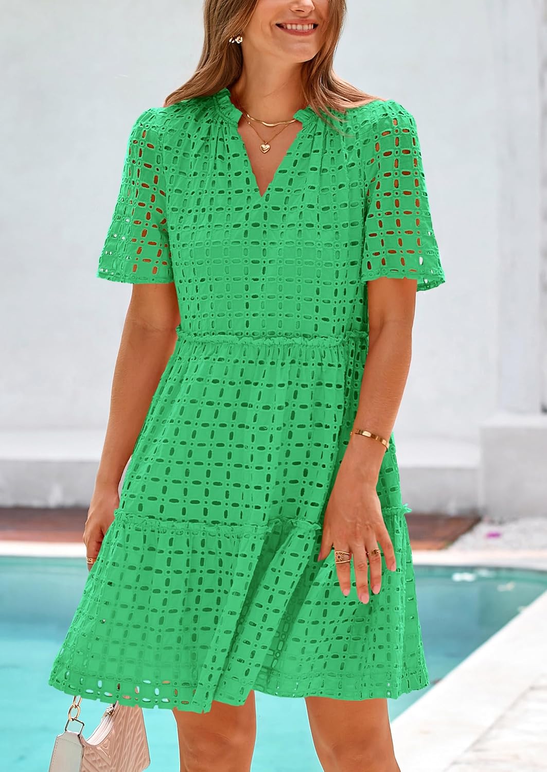 PRETTYGARDEN Summer Dresses for Women 2025 V Neck Hollow Out Eyelet Ruffle A Line Swing Short Beach Vacation Dress