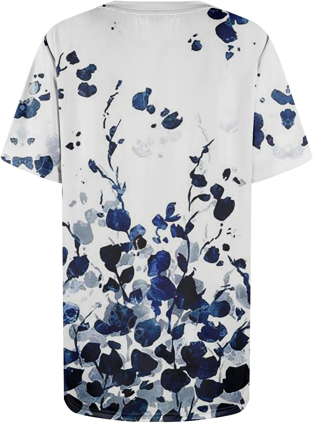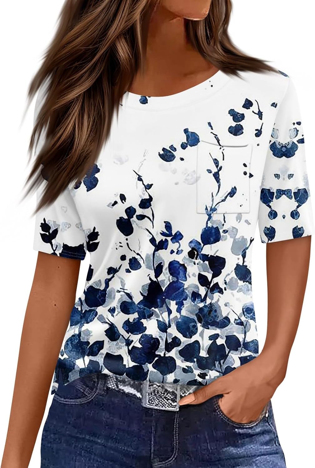 Summer Tops for Women 2025 Vacation Trendy Round Neck Boho Short Sleeve Shirts Casual Loose Comfy Blouses with Pocket
