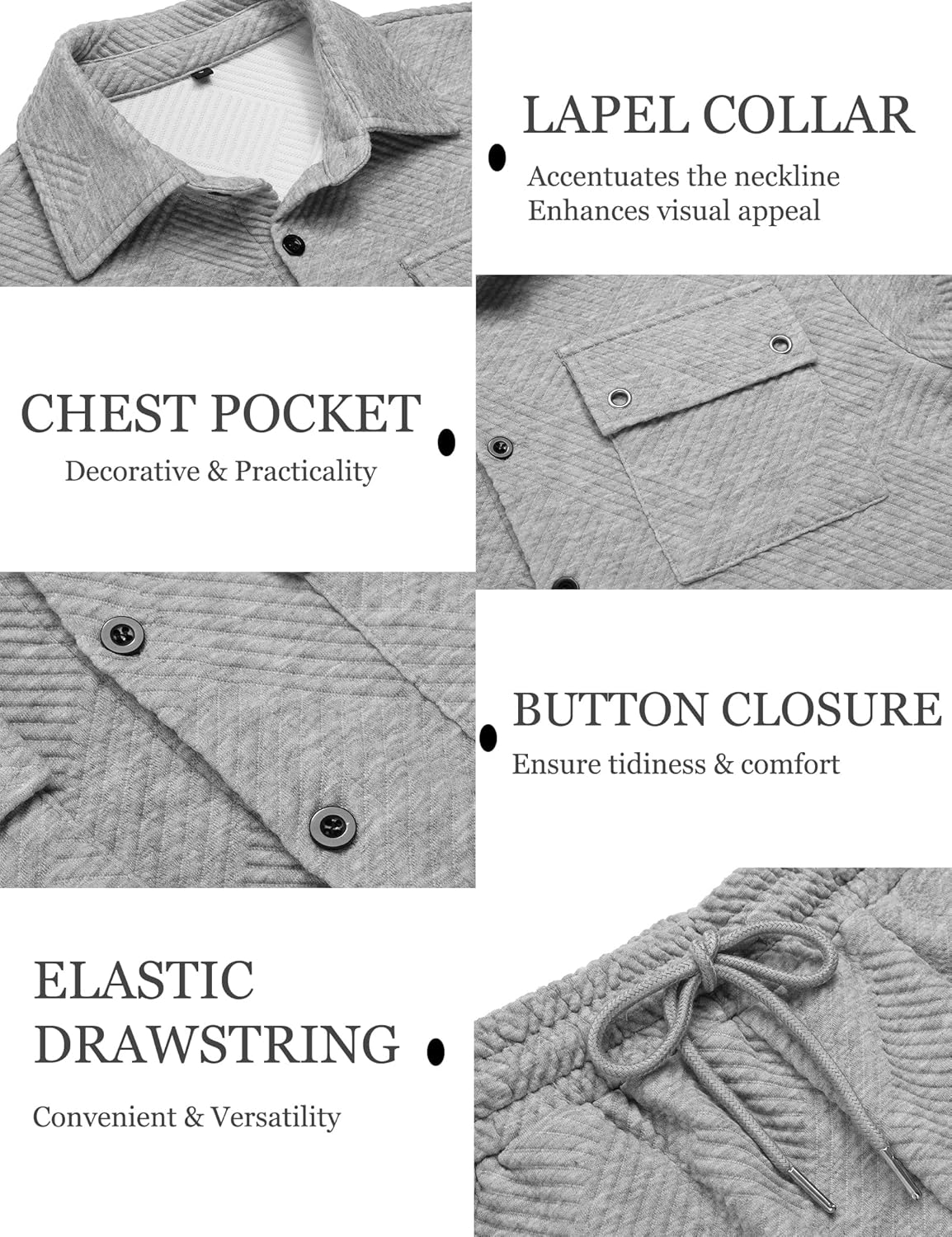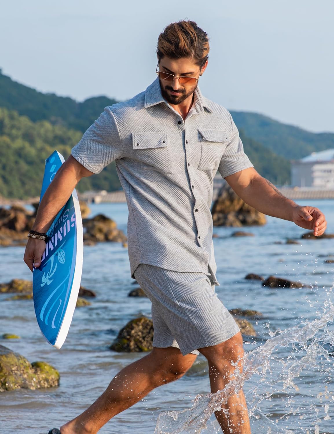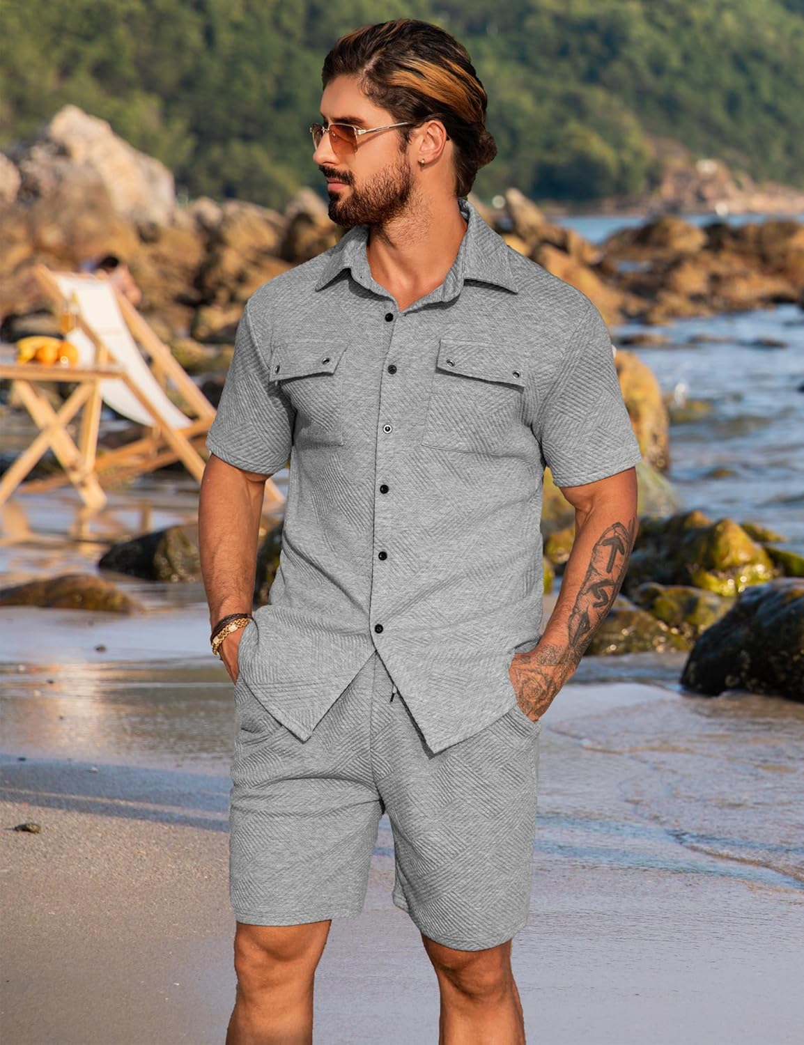 Men’s Summer Beach Outfits 2 Piece Short Sleeve Shirts and Shorts Texture Sets